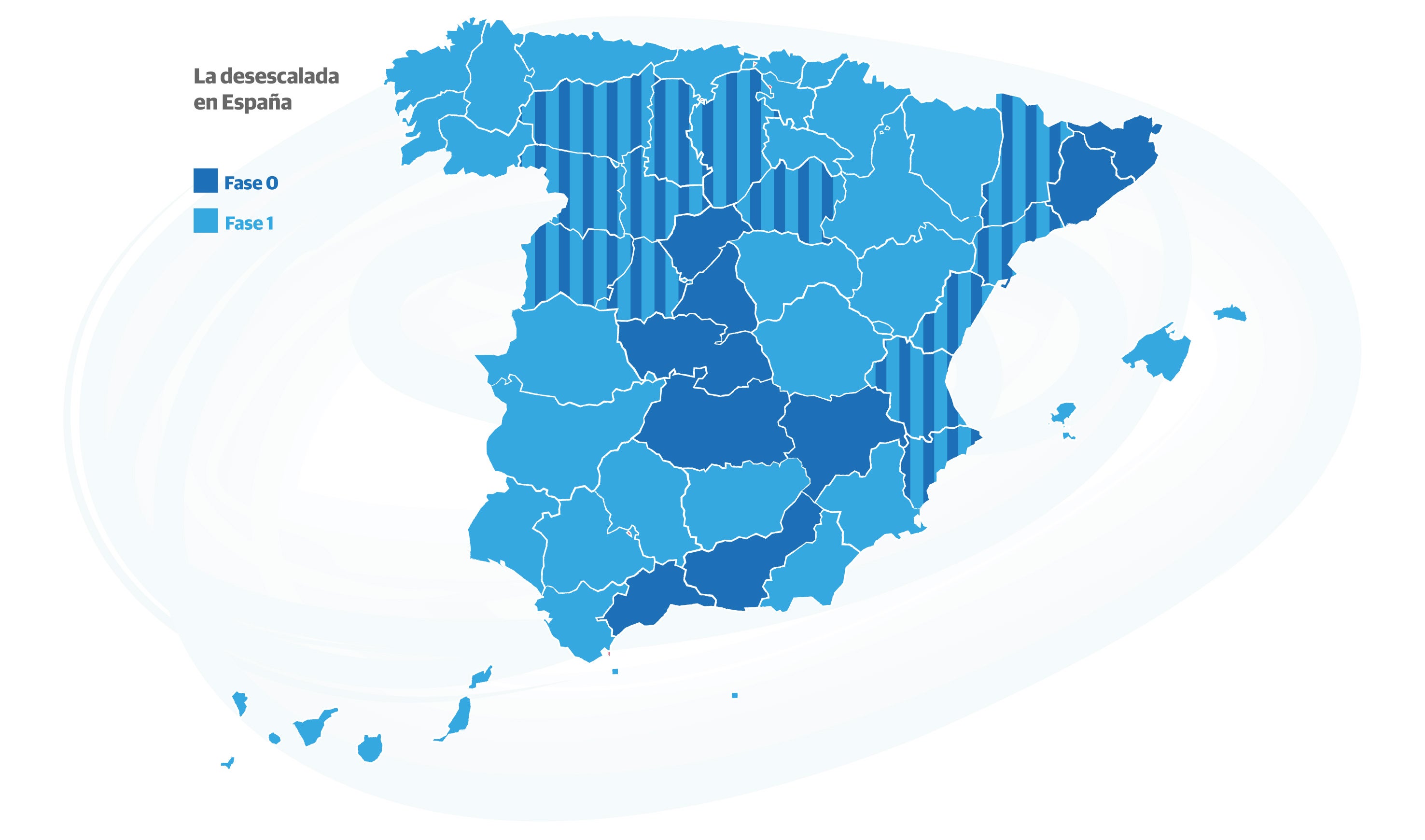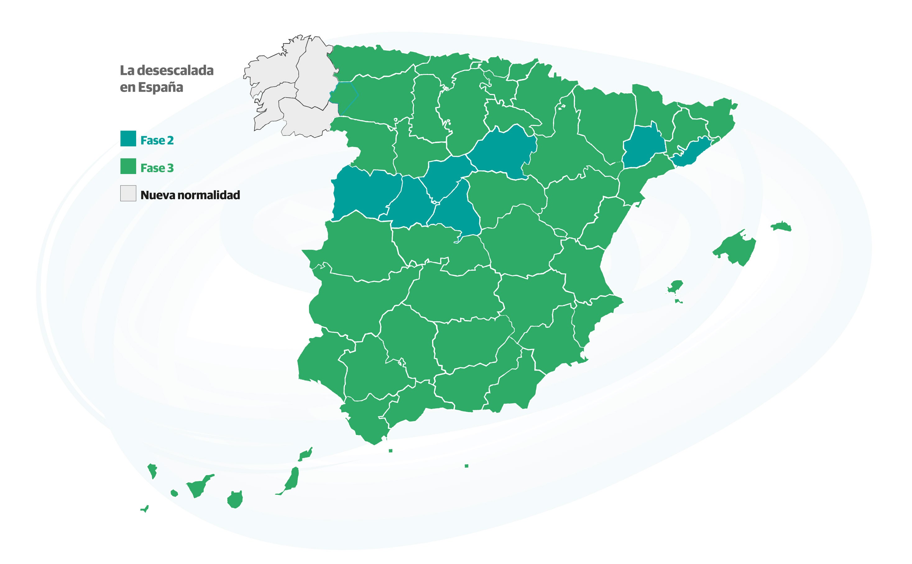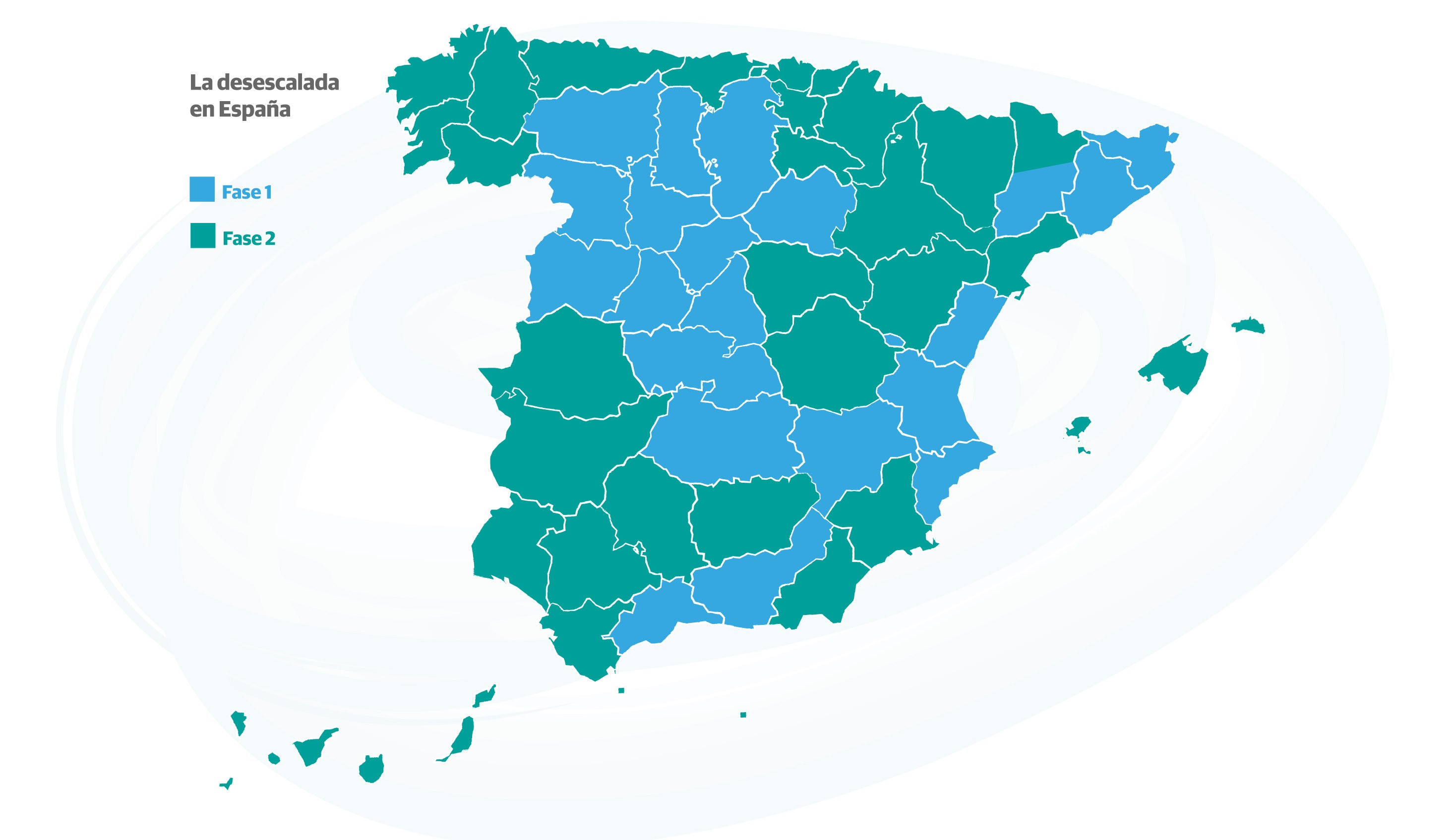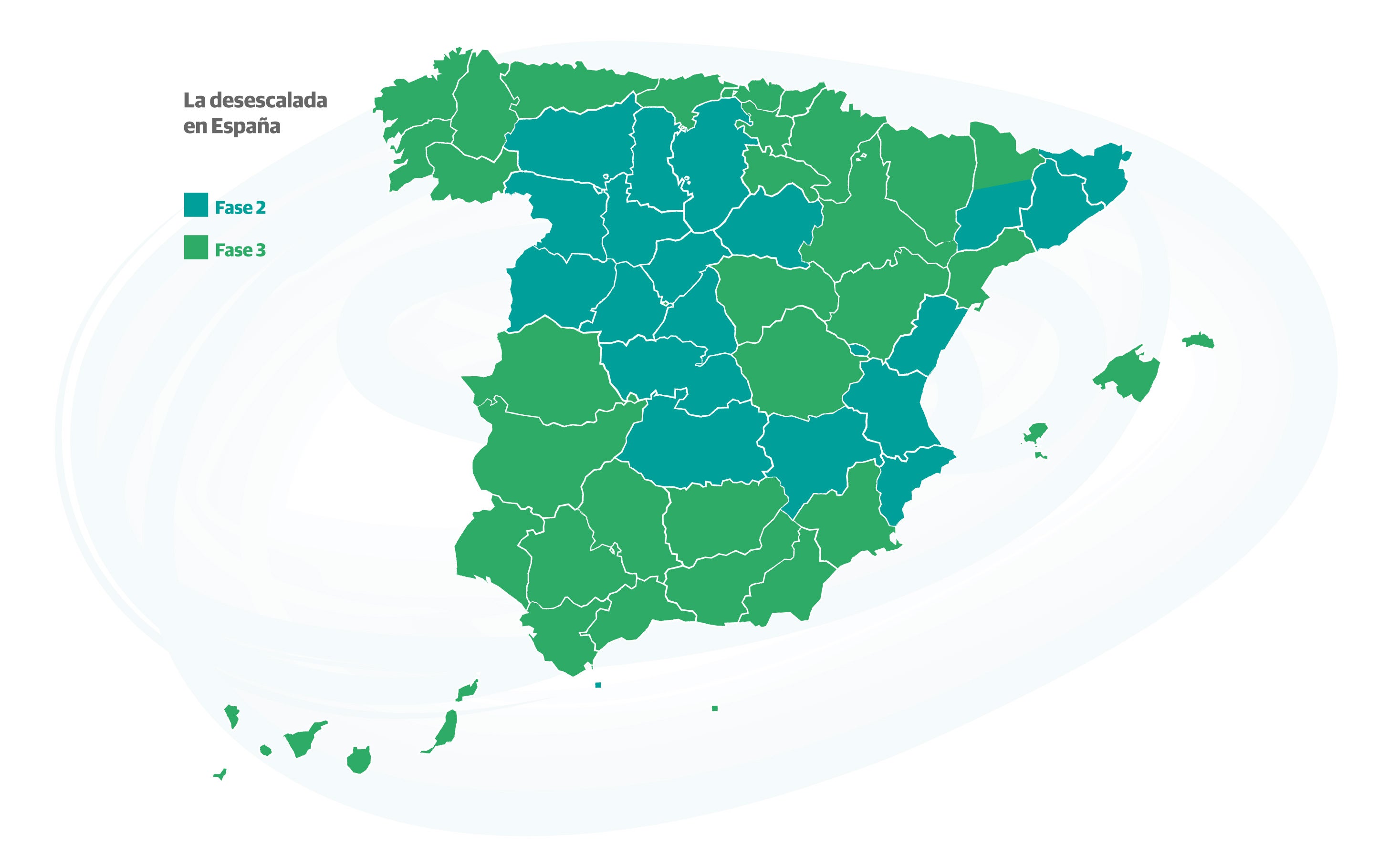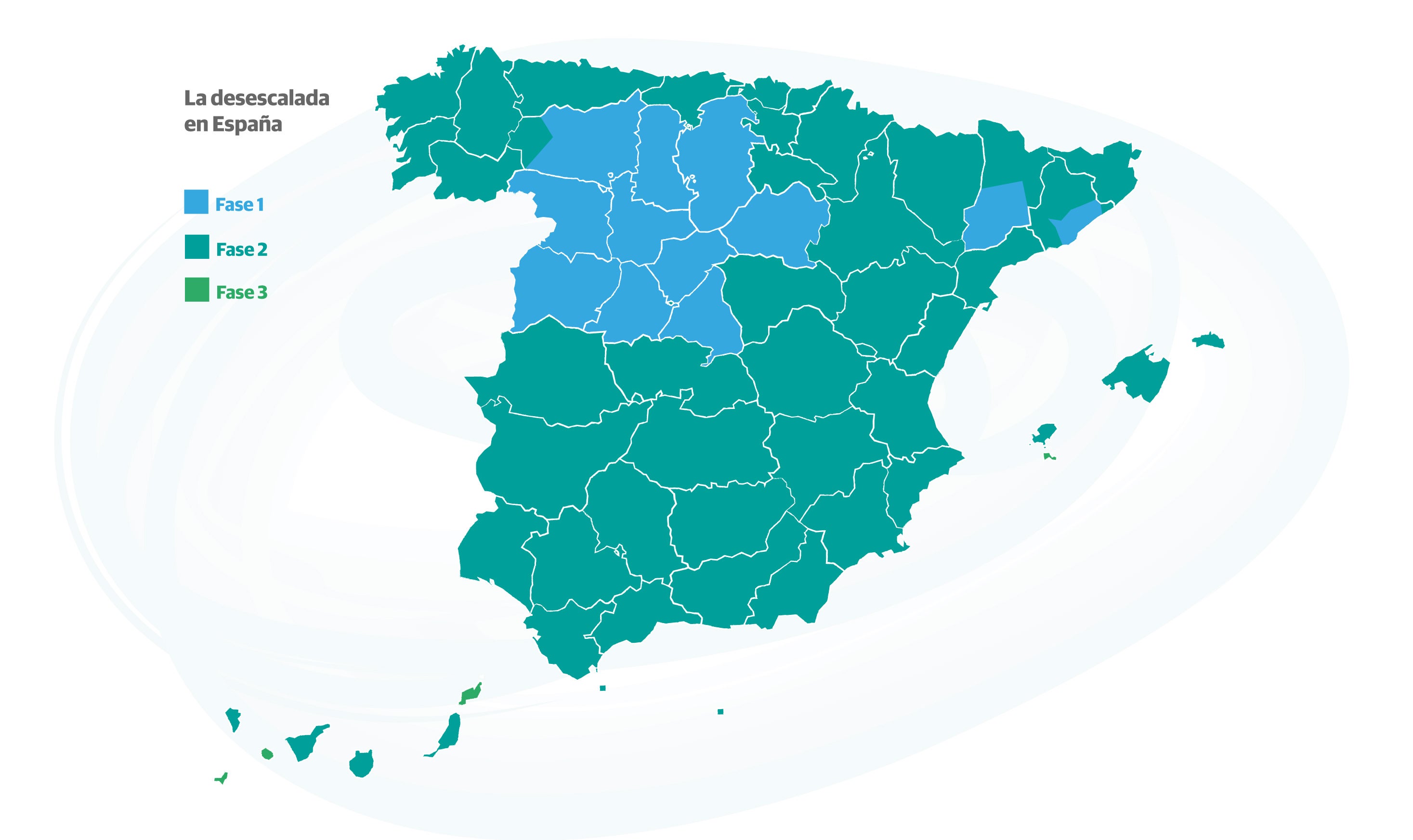 En cuando a la desescalada, toda España está ya en fase 2, salvo Madrid, Barcelona, Lleida y parte de Castilla y León. Además, las islas canarias de El Hierro, La Gomera y La Graciosa y la balear de Formentera pasan a fase 3.