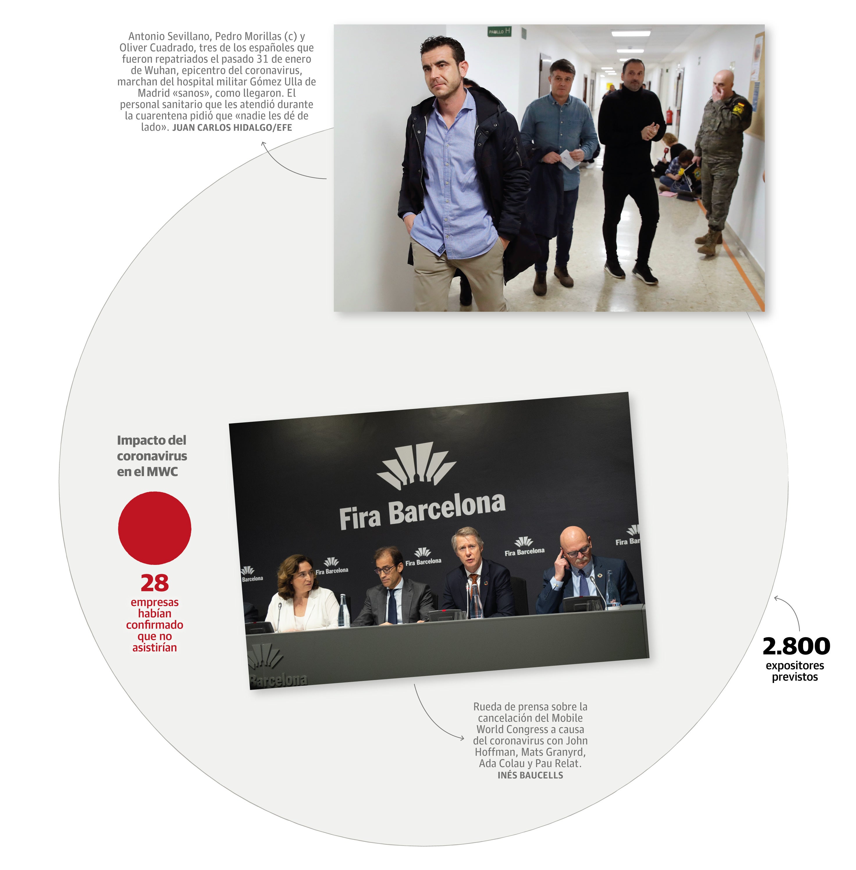 Adiós al Mobile. Barcelona deberá esperar un año para celebrar su cita mundial con la tecnología móvil. Pedro Sánchez asegura que esta cancelación «no responde a razones de salud pública en España». Además, los repatriados españoles terminan su cuarentena. En marzo se conocería que la primera víctima mortal del coronavirus en España falleció este día en Valencia. En este momento, la epidemia mundial supera los 60.000 contagios y 1.300 muertos.