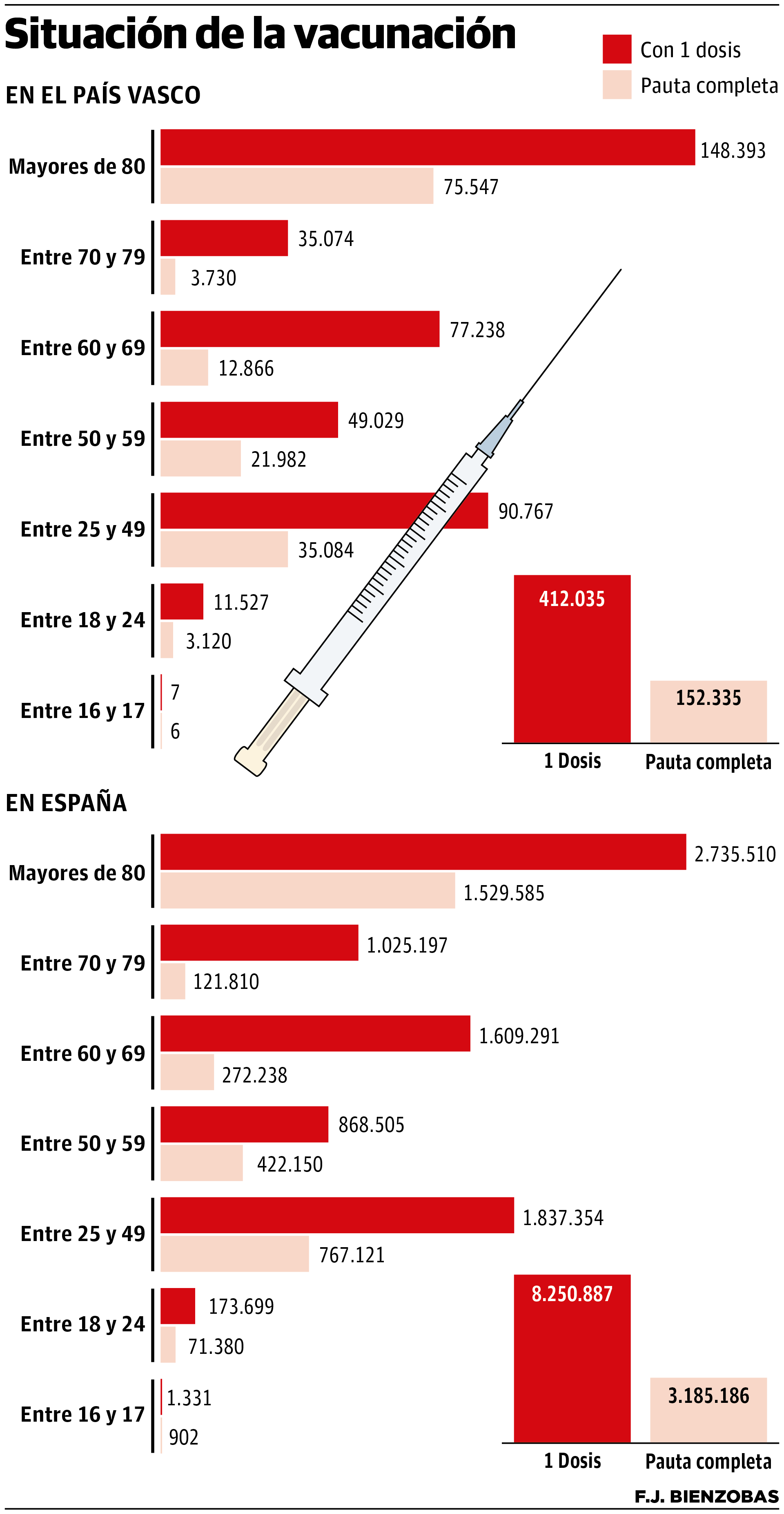 Desde que comenzó la campaña de vacunación en las residencias de mayores, diferentes colectivos han recibido las inyecciones correspondientes. Tras inocular a los usuarios y ... trabajadores de los geriátricos vascos y a los trabajadores esenciales y con la paralización de AtraZeneca en menores de 60, la prioridad ahora va por grupos etarios. Con la mayoría de octogenarios y nonagenarios con al menos una dosis, los esfuerzos se centran en las personas de entre 70 y 79 años, si bien Euskadi solo ha vacunado con la primera dosis al 16,5% de este grupo y con la segunda, al 1,8%, según el último boletín del Ministerio de Sanidad.