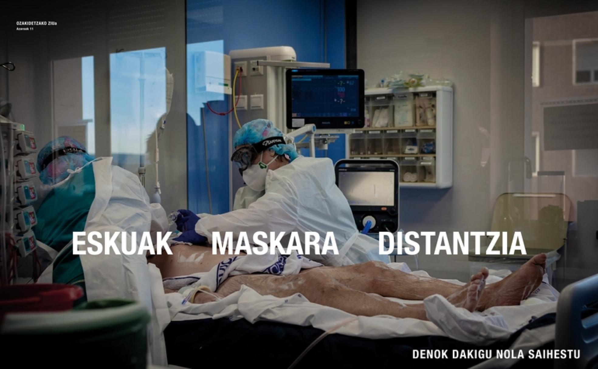 Las instituciones vascas apuestan por dar a los ciudadanos un batacazo de realidad. La campaña anunciada este jueves muestra la crudeza de las escenas que se viven cada día en las UCIs de los hospitales que atienen a los enfermos con Covid-19. Los carteles, fotos y los dos vídeos que conforman la campaña no dejarán a nadie indiferente.