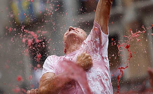 La plaza del Ayuntamiento todavía ofrece la oportunidad de adentrarse a falta de 15 minutos. La lluvia retrasa la llegada en masa, pero poco antes de la hora ya no cabe un alfiler. «Hay menos gente pero la sensación de agobio es mayor», comenta Naia, una vecina de Iruñea que se deja la voz en la plaza. Se escucha a Unzué, pañuelos al cielo, se dispara el chupinazo y se desata la locura. Y, por supuesto, se ducha de vino todo aquel que está presente. No sale de la plaza ninguna camiseta ni pantalón blanco con su color original. Este redactor da fe de ello. El ambiente es de total festividad, sin incidentes, más allá de los empujones necesarios para desplazarse en aquel mar rojiblanco.