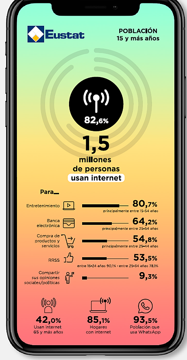 Más de 1,5 millones de personas (1.551.600) de 15 años y más son usuarias de internet en Euskadi, el 82,6% de la población vasca, lo que supone un aumento de 2,4 puntos porcentuales en el primer trimestre de 2020 con respecto al mismo periodo del año anterior.