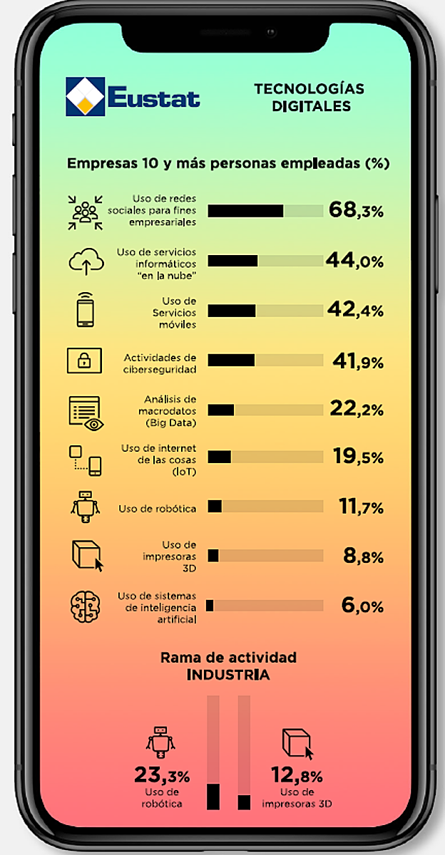 El uso de las redes sociales también se ha extendido a las empresas vascas como una de las tecnologías digitales más utilizadas. De hecho, el 68,3% de los establecimientos de 10 y más personas empleadas usan redes sociales para fines empresariales, aumentando en 2020, 2,3 puntos porcentuales respecto al año anterior.