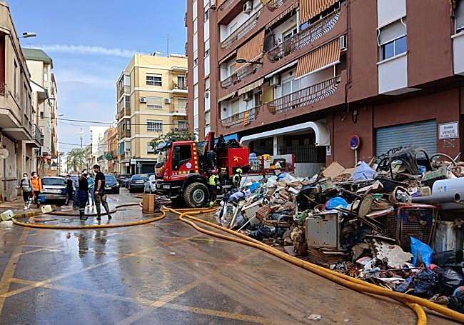 «En cuanto ha bajado el agua de los garajes hemos entrado a revisar los coches y, afortunadamente, no hemos encontrado a nadie», cuenta Ramón Bianchi, suboficial de bomberos de Donostia que se encuentra ayudando a achicar agua junto a otros nueve voluntarios en la localidad valenciana de Alfafar.