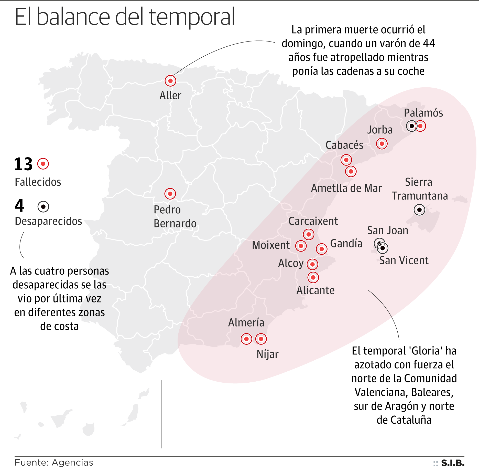 La borrasca 'Gloria', la séptima de la temporada y primera de 2020, deja ya doce víctimas mortales, tras el hallazgo del cadáver de un pescador en L'Ametlla de Mar (Tarragona) al ser arrastrado por una ola. Además, tres personas continuan desaparecidas y el temporal sigue sumando daños severos con crecidas de ríos, playas engullidas, zonas del litoral anegadas, vías cortadas y miles de alumnos sin clase.