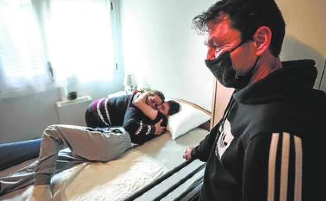 En la mesilla, junto a su cama, una vela eléctrica para evitar sustos ilumina la imagen de varios santos. Su madre le da abrazos infinitos y besos sonoros. Su cuidado es lo que da sentido ahora a su vida. Se ha convertido en una auténtica «enfermera». Se levanta cada día como si siguieran en el hospital. Le alimenta por sonda cinco veces al día y le da tres pastillas, una dos veces al día y otra, tres. Le asea y le pasea. Cuando tiene que ir al médico o a realizar alguna gestión, Eugenio pide día libre en el trabajo porque no se puede quedar solo. «Cuando se enfada, tira cosas. Se puede caer y hacerse daño».