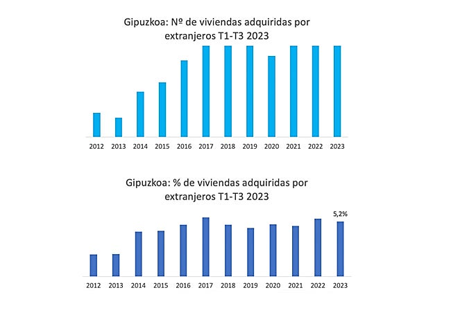 Areizaga señala que «según los últimos datos del INE, en 2023 los extranjeros representaron el 5,2 % de las operaciones en Gipuzkoa, con 267 transacciones hasta el tercer trimestre, menos que en 2022, cuando se registraron 293. A pesar de estas cifras, la demanda extranjera en el mercado de viviendas en Gipuzkoa tiene una incidencia residual y se encuentra considerablemente por debajo de la media nacional, donde los extranjeros realizan el 11 % de las transacciones».