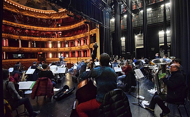 El teatro acoge la grabación de los vídeos con la 'Marcha de San Sebastián' y otras seis piezas de Sarriegui que se emitirán por internet el próximo día 20