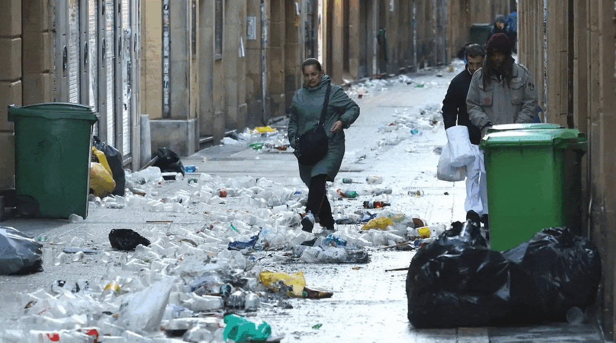 Saltos entre una marea de basura en la Parte Vieja tras una masiva madrugada de San Sebastián