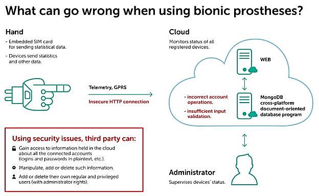 El equipo de Kaspersky ha demostrado que las webs que administran los datos que recogen las prótesis conectadas pueden recibir ataques, aunque de momento no puedan afectar al movimiento de esas prótesis ya que éstas no reciben datos, por ahora se limitan a enviarlos.