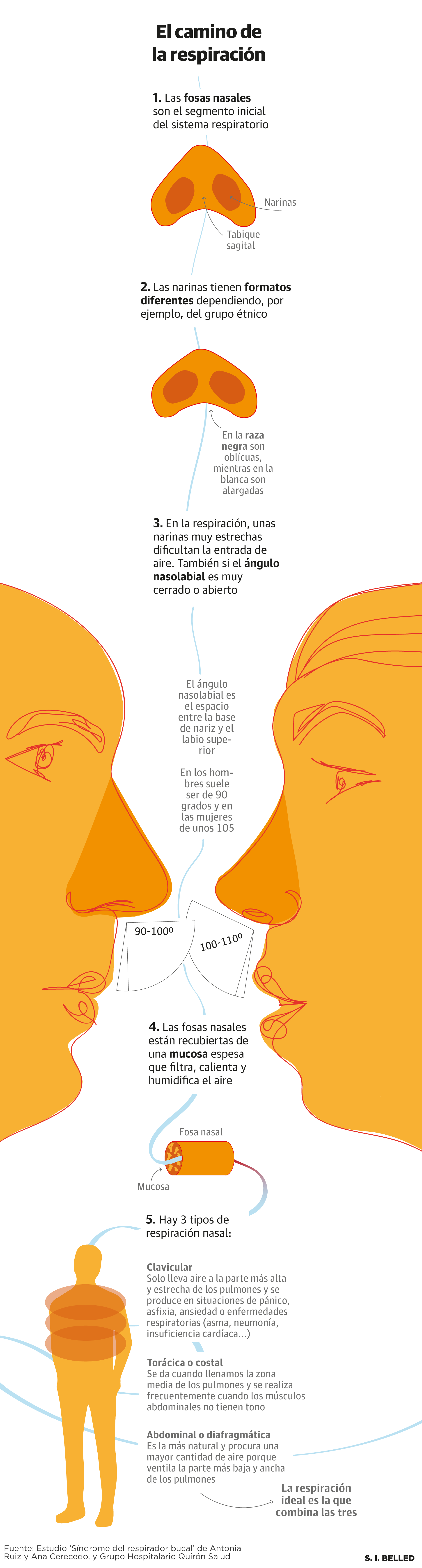 La nariz juega un papel esencial en todo esto, pues es el lugar de entrada del aire, y su forma es uno de los aspectos que determina su buen funcionamiento. El tamaño de las narinas (orificios nasales) está influenciado por características como la raza. Así, en la raza blanca son alargadas y en la negra son oblicuas, siendo las narinas estrechas las que más dificultan la entrada de aire. Por otro lado, el ángulo nasolabial, es decir, el que se forma entre la base de la nariz y el labio superior, es de alrededor de 90 grados en el hombre y de unos 105 en la mujer; y cuando este ángulo está muy cerrado, o muy abierto, dificulta la respiración nasal. Así lo explican las especialistas en Audición y Lenguaje Antonia Ruiz y Ana Cerecedo en su trabajo 'Síndrome del respirador bucal', un estudio sobre los problemas que causa una mala función respiratoria.