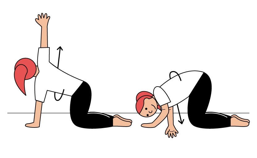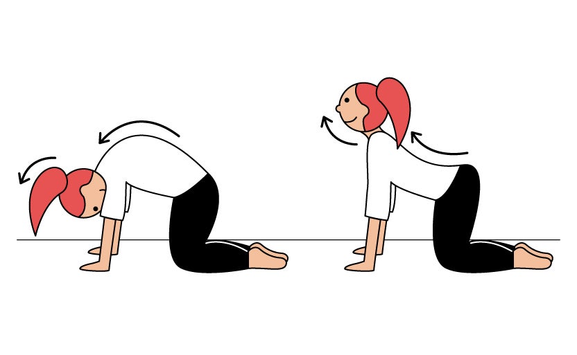 Colóquese a cuatro patas, con las manos y las rodillas paralelas y la espalda recta. Durante la inhalación, levante la cabeza y el sacro hacia arriba. En la exhalación, invierta la postura formando un arco. Repita realizando varias respiraciones.