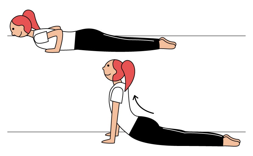Boca abajo sobre la esterilla, apoyamos las manos a la altura del pecho y poco a poco levantamos el pecho y llevamos la mirada hacia el techo. Después volvemos a la posición de partida y repetimos.