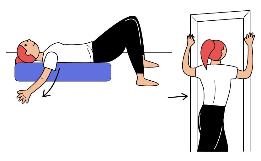 Si dispone de un rodillo (como los de pilates), colóquelo en el suelo y túmbese boca arriba sobre él, disponiendo el rulo a lo largo de su columna vertebral. Después, estire los brazos en cruz hacia el suelo. Si no dispone de esta herramienta, utilice el marco de una puerta. De pie, estire los brazos en cruz y flexione los codos llevando las manos hacia arriba. Coloque las palmas sobre el marco de la puerta y, con un pie más adelantado que otro, inclínese hacia delante para notar el estiramiento.