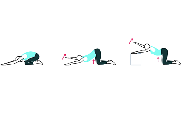 Sentado sobre los talones y sin levantar el glúteo, estire el tronco y los brazos hacia delante sobre el suelo. Después, despegue alternativamente los brazos hacia arriba, sin mover la espalda. Si no puede ponerse en esta posición, realice el ejercicio manteniendo las rodillas en un ángulo de 90º y lleve el pecho hacia el suelo. Si le cuesta, coloque las manos sobre un apoyo.