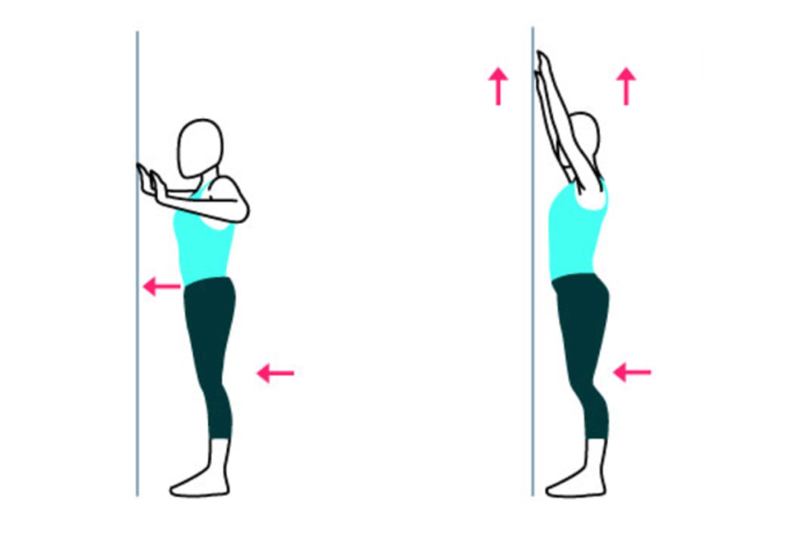 Frente a la pared, con la espalda recta y las rodillas ligeramente flexionadas, apoye las manos a la altura de los hombros. Con los codos en 90º, empuje durante unos segundos y vuelva a la posición inicial. Cuando termine la serie, otro ejercicio en la misma postura consiste en trepar con las manos por la pared hasta hacer una completa extensión de brazos y espalda y volver a la posición inicial.