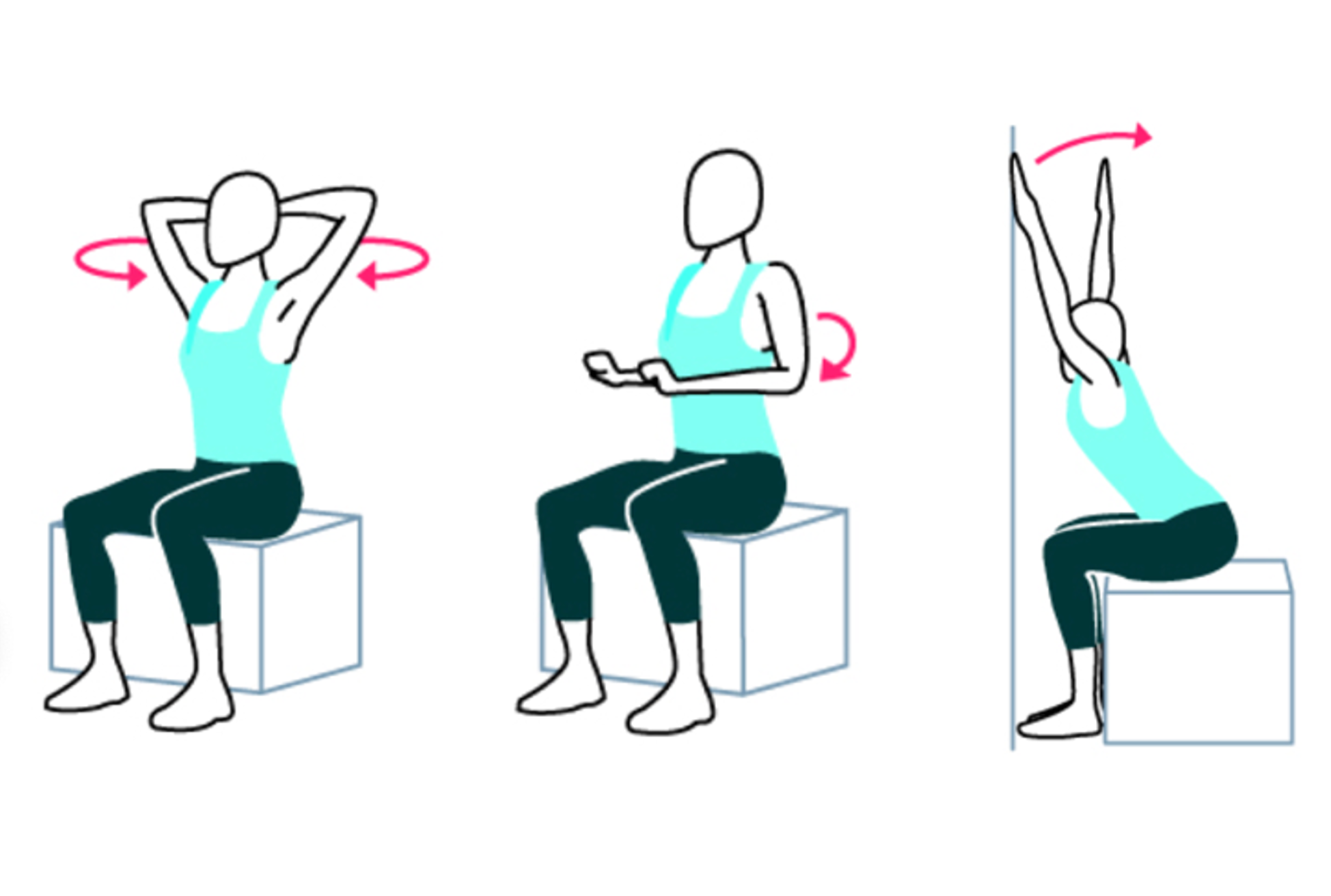 Sentado con la espalda recta, ponga las manos en la nuca, inhale lento mientras lleva los codos hacia atrás y exhale al volver a la posición inicial. Lo mismo puede realizarse con los brazos flexionados a los costados en 90º. Un tercero es, frente a una pared, extender los brazos y apoyar las manos sobre ella. Adelantar el busto y separe de la pared los brazos extendidos alternativamente. También puede hacer lo mismo separando los brazos simultáneamente.