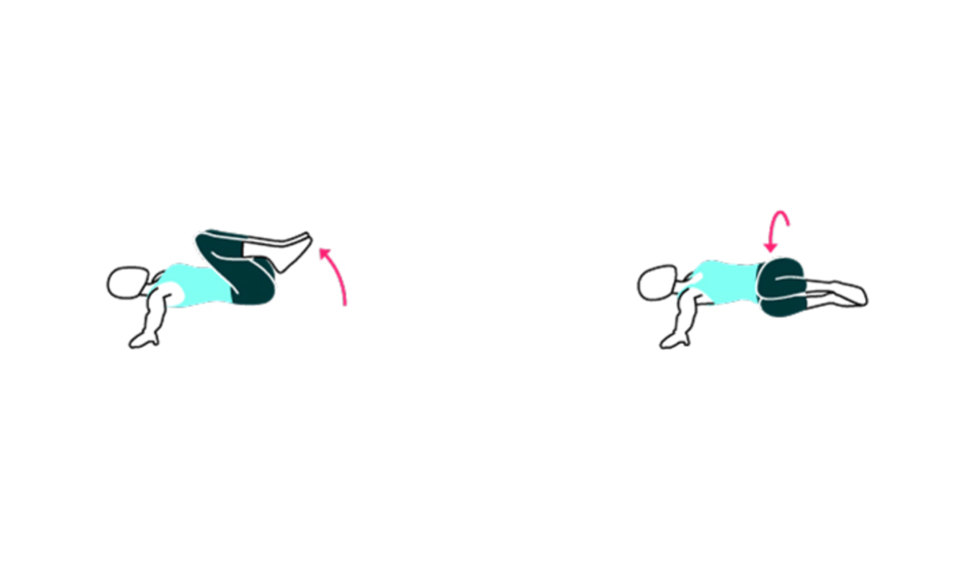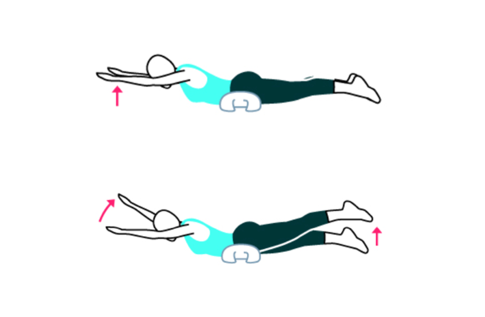 Túmbese boca abajo y ponga un cojín bajo el abdomen. Con los brazos extendidos hacia delante y la frente apoyada en el suelo, levante los brazos simultáneamente sin mover la cabeza. Repita el ejercicio elevando los brazos alternativamente. Después, hágalo igual, pero levantando el brazo y la pierna contraria alternativamente.