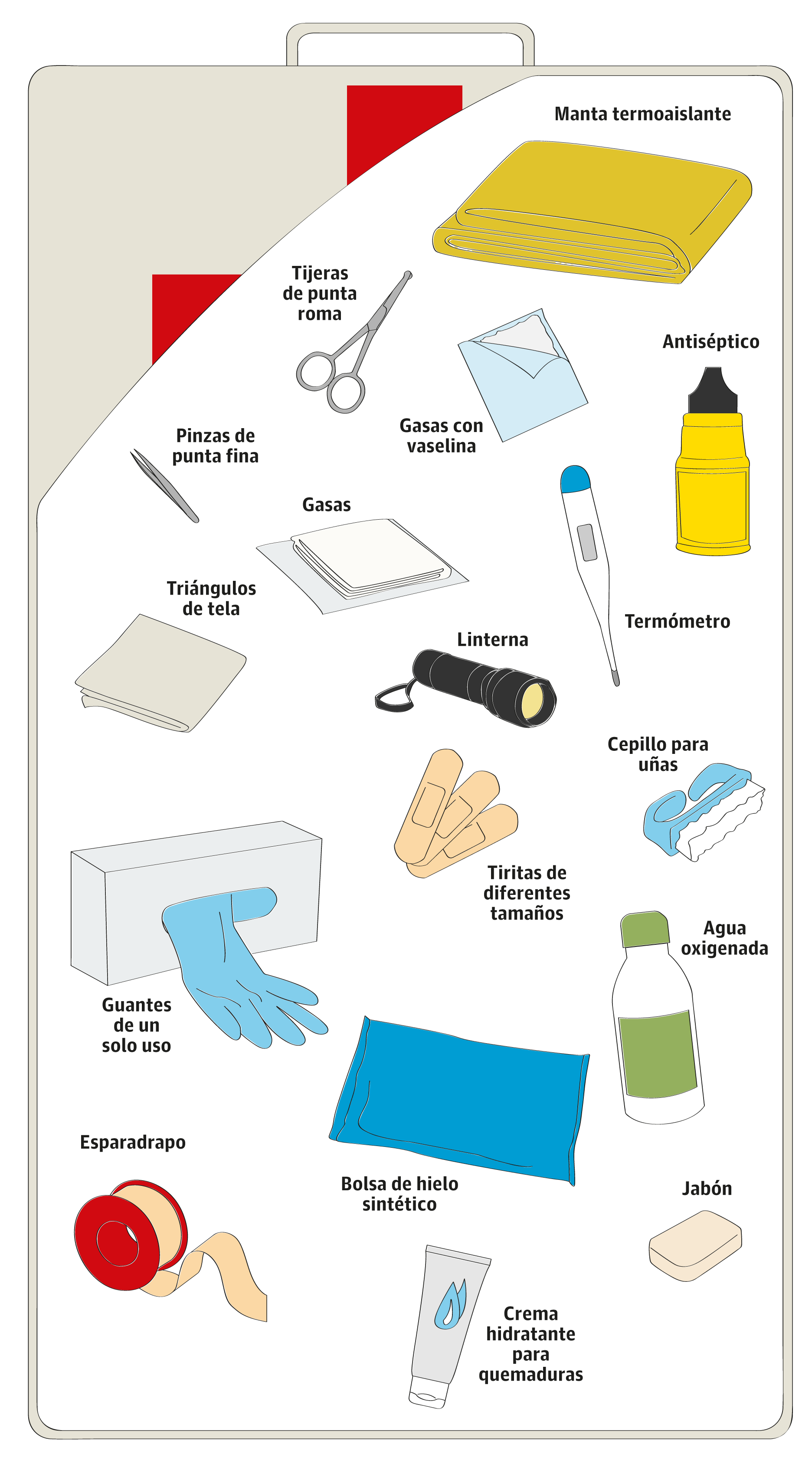 Desde Cruz Roja sugieren: jabón para lavarse las manos y para lavar la lesión antes de proceder a su cura; cepillo de uñas, guantes de un solo uso; gasas, en sobres unidosis de 4 o 5 unidades para limpiar heridas y contener hemorragias (nunca con algodón, porque pueden quedar fibras en el interior de la zona afectada e infectarla); esparadrapo; antiséptico incoloro (tipo clorhexidina) o coloreado (tipo povidona yodada); tiritas; triángulos de tela, para inmovilizaciones y vendajes improvisados; agua oxigenada, para detener hemorragias de la piel y de la boca, no como desinfectante; vendas; termómetro; crema hidratante para quemaduras; gasas con vaselina; bolsa de hielo sintético, para reducir la inflamación; tijeras con punta redondeada; pinzas de punta fina, para eliminar cuerpos extraños atrapados en la herida; manta termoaislante de color oro o plata; linterna; y libreta de papel y lápiz o bolígrafo, para anotar las indicaciones que nos dé el personal médico por teléfono o detalles importantes. Asimismo, es conveniente tener a mano un listado de teléfonos útiles, como el de emergencias (112), el de familiares cercanos, el del centro de salud o el del Servicio de Información Toxicológica, entre otros.