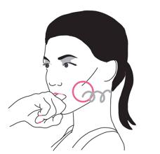 Coloca el lateral de la mano justo en el borde inferior de la mándíbula. Desde aquí haz una ligera presión hacia arriba y hacia atrás. Repite la maniobra en el otro lado. Indicado para: Especialmente para los acúfenos (pitidos de oído), pero también mejor el bruxismo.