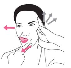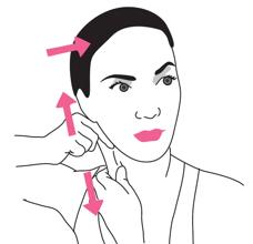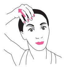 Coloca los dedos en garra cubriendo la frente, justo por encima de las cejas. Deslízalos hacia arriba, hasta llegar al cuero cabelludo. Mientras haces este masaje ascendente, levanta las cejas y pon cara de sorpresa. Indicado para: Minimizar las arrugas horizontales de la frente y aliviar la presión en la cabeza.