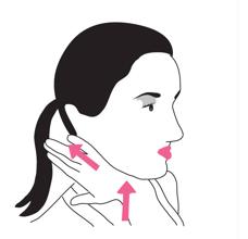 Saca la lengua y llévala al lado derecho todo lo que puedas. Los ojos miran en la dirección de la lengua y la mano estira ligeramente la mandíbula. Con los dedos índice, corazón y anular, haz un ligero deslizamiento hacia arriba y hacia atrás. Luego cambia de lado. Indicado para: Es un ejercicio que alivia el bruxismo y también va bien para la carraspera de garganta y los pitidos de los oídos.