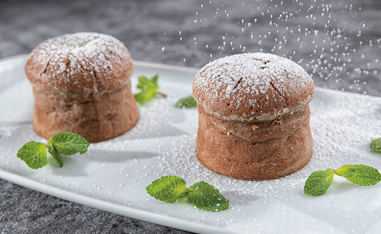 Encamisamos después con papel de cocina sulfurizado o untando con mantequilla y espolvoreando con harina unos moldes circulares de 5 centímetros de diámetro y 4,5 centímetros de altura. Con la ayuda de una cuchara colocamos en cada uno de los moldes encamisados 40 gramos, aproximada-mente, de masa, insertando a la vez una onza de chocolate negro en la mitad y cubriéndola posteriormente con otros 20 gramos más de masa. Horneamos, por último, los bizcochitos en el horno a 180 grados durante un tiempo que oscile entre unos 15 y unos 20 minutos, aproximadamente.