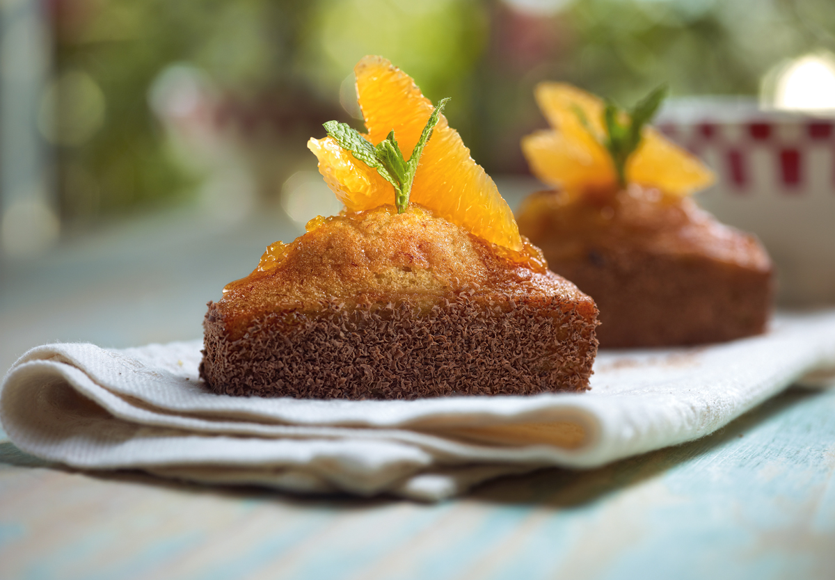 4. Acabado y presentación. una vez horneados los bizcochos, cuando estén templados para evitar quemarnos, con la ayuda de un pincel se bañan con el zumo de naranja.Sobre cada bizcocho se ponen los gajos de naranja y la mermelada de naranja confitada. Finalmente, y antes de comerlos, se ralla por encima y por los costados un poco de chocolate negro. El contraste con la naranja es estupendo.