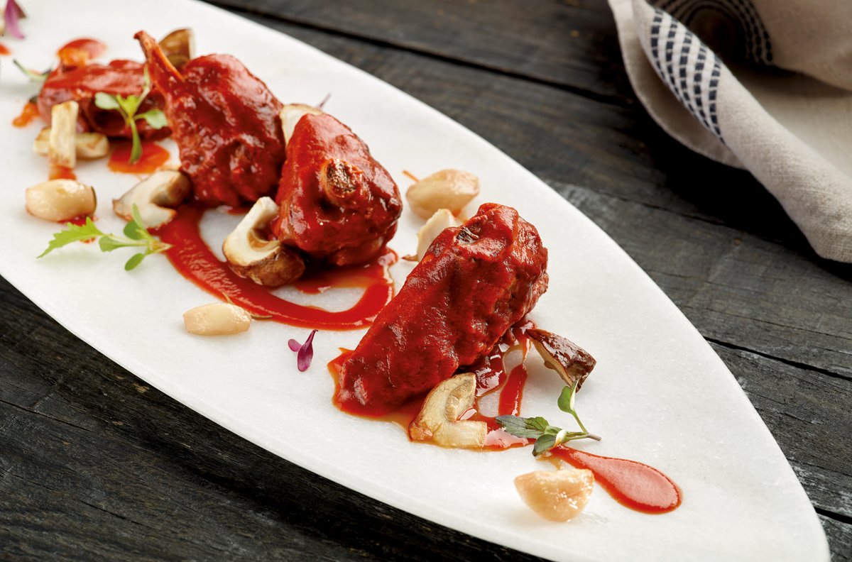 3. Acabado: se escurre la carne con una espumadera y se reserva, triturando la salsa con una batidora, hasta que quede lisa. Se devuelve la carne a la salsa y se le da un hervor para que el guiso se integre, añadiendo en pleno hervor la miel y rectificando el sazonamiento. Se escurren los ajos confitados con un colador.