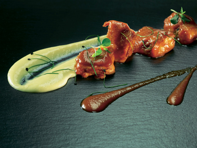 Acabado y presentación: se tritura la salsa de cebolla, se mezclan con ella los morros rebozados y se da un último hervor. Acompañamos con puré de patata bien caliente.