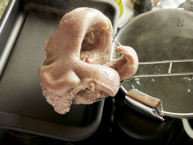 1. Se blanquean los morros en agua hirviendo, se escurren y se afeitan con una maquinilla.