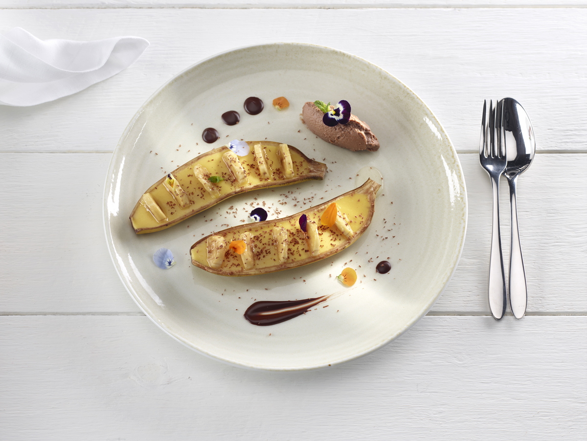 4. Antes de servir, se monta la mezcla de chocolate fría con unas varillas eléctricas, hasta obtener la consistencia de un chantillí. Sobre los medios plátanos fríos rellenos con la mousse se acomodan las rodajas de plátano pringadas de almíbar. Se acompaña el plátano relleno con el chantillí de chocolate y unas hojitas de menta fresca.