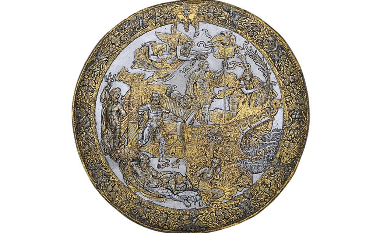 A los reyes del Renacimiento les apasionaba la Antigüedad clásica. Adornaban con escenas mitológicas sus palacios... y sus armas. La Rodela de la apoteosis de Carlos V es heredera de los escudos de Aquiles y Eneas, pero no fue forjada por el dios Hefesto, sino por maestros italianos en torno a los años 1535 y 1540. En acero, oro y plata, canta las glorias militares del emperador en triunfo, con los laureles romanos, y equipara sus proezas con las del mítico Hércules, representado aquí con las columnas al hombro. Su presencia hace también referencia al «Plus ultra», lema adoptado por Carlos V y que aún pervive en el escudo de España. Todo el ideario de un reinado, tintes caballerescos, defensa de la religión, gloria imperial, hazañas bélicas, condensado en un 'publirreportaje' de apenas 54 centímetros de diámetro.