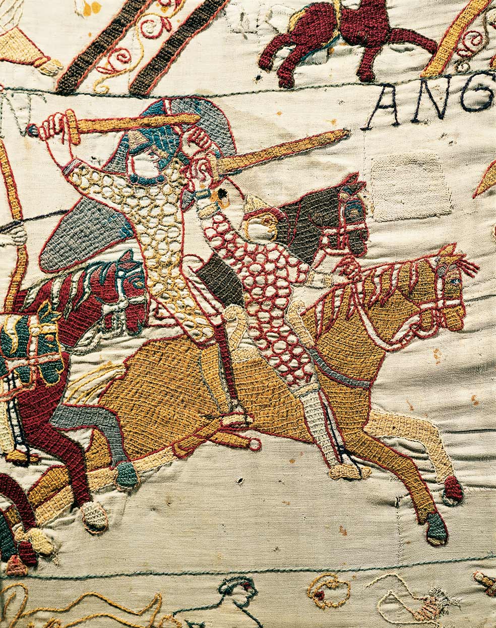 El tapiz de Bayeux, del siglo XI, es un importante documento histórico. Este gran lienzo bordado narra los hechos previos a la conquista de Inglaterra liderada por el monarca normando Guillermo el Conquistador y que culminó en la batalla de Hastings, en 1066 y la victoria del candidato normando al trono de Inglaterra y la derrota de su oponente, el anglosajón Harold.