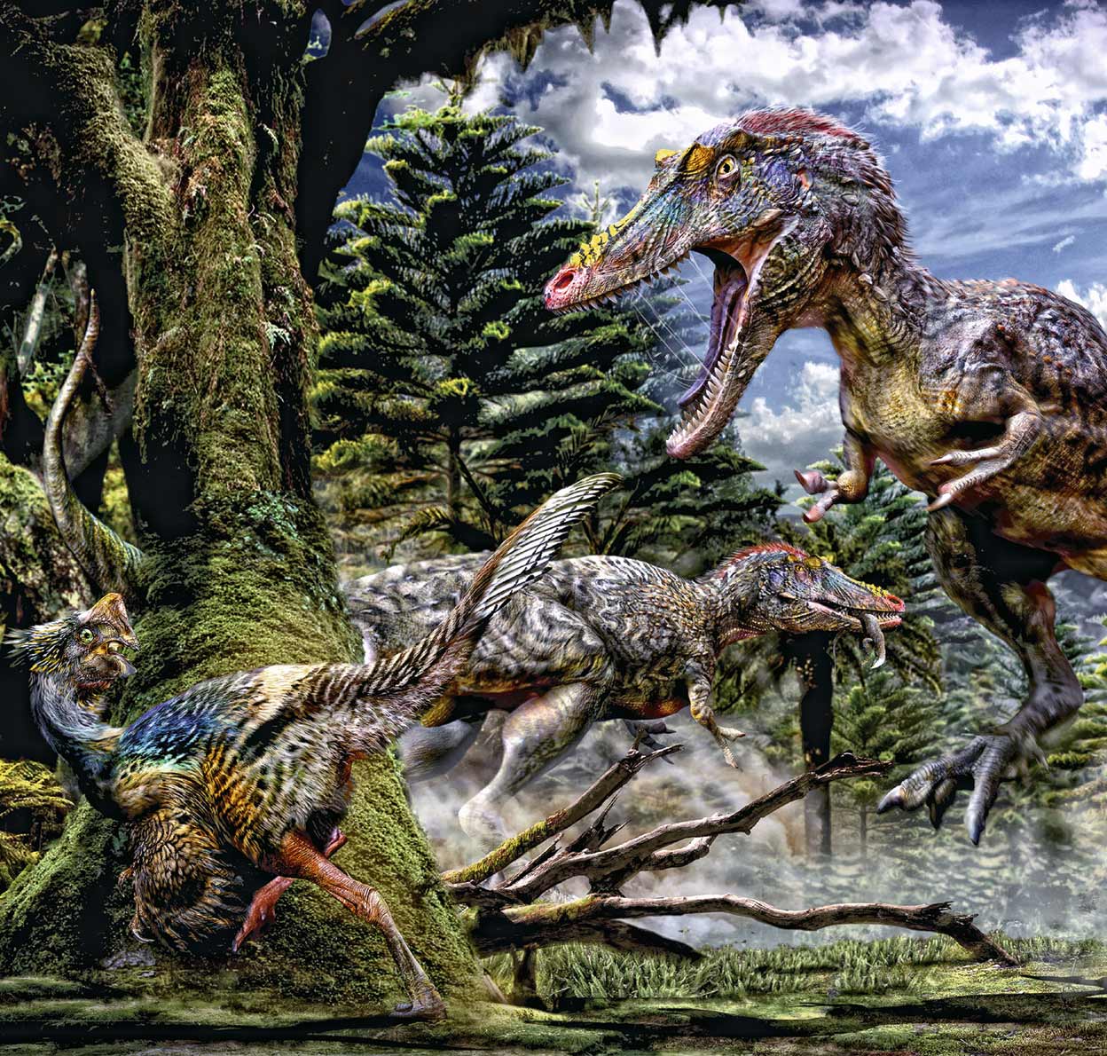 Pocos minutos más tarde, un olor acre llegó a su hocico. Posibles presas se escondían tras un muro de coníferas. Con lentitud, asomó su cabeza a un claro en el bosque y vio un grupo de Nankangia, dinosaurios emplumados que podrían saciarlo, pero cuya agilidad le pondría las cosas difíciles. Cuando se lanzó al ataque, el bosque pareció cobrar vida. Otro tiranosaurio de aspecto diferente surgió de la espesura. Era más estrecho, más pequeño, menos poderoso. Pero mucho más veloz. El nuevo actor atrapó sin vacilación a uno de los Nankangia y lo arrastró a la espesura mientras nuestro hambriento tiranosaurio intentaba, corriendo en vano tras él, atrapar otro de los dinosaurios emplumados. Una vez más, su primo de morro estrecho le había tomado la delantera.