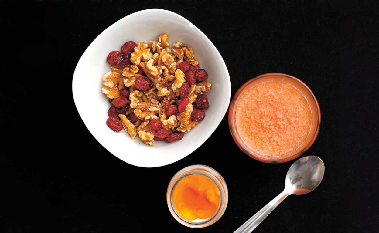 «Desayuno tarde. Son las doce y todavía no he empezado. Tomo nueces con pasas, mango, pera, zumo de pomelo, un poco de kéfir con miel y alguna galleta».