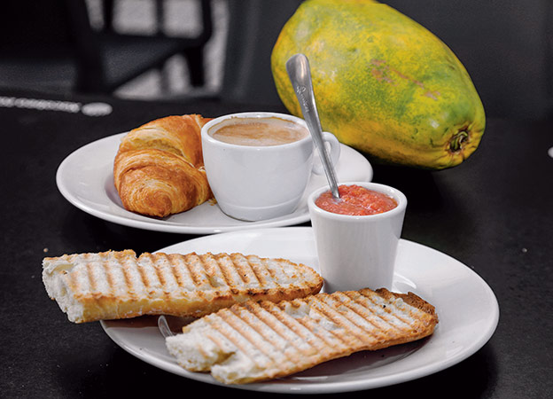 «Una rebanada de pan tostado con aceite, tomate y sal. Papaya y un zumo de naranja. Un café cortado y un minicruasán».