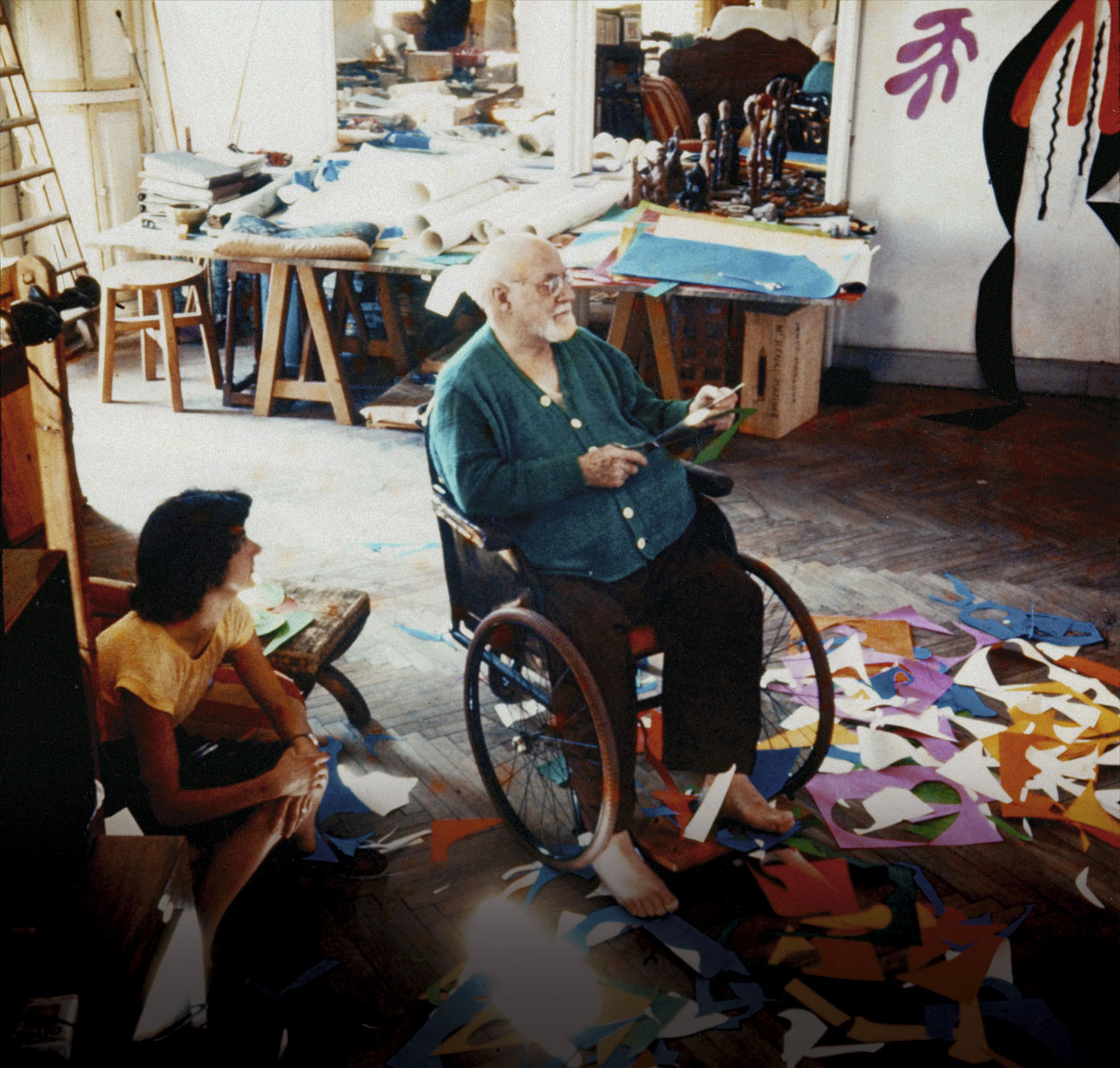 Matisse padecía una discapacidad tras haber sufrido una colostomía en 1941 y raras veces se movía de la cama o de su silla de ruedas. De hecho, hizo que pusieran la cama en el centro de su taller. Desde allí impartía sus instrucciones blandiendo un bastón de bambú.