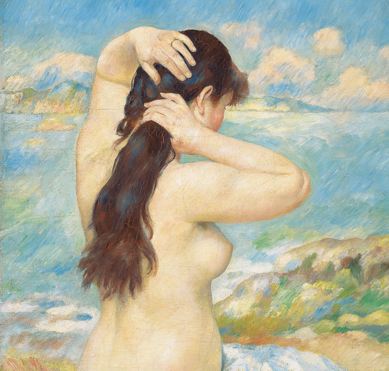 A comienzos de siglo, Renoir se ve confinado a una silla de ruedas. La artritis le ha reventado las articulaciones. Debe sujetarse el pincel a la mano completamente deformada con esparadrapo; él lo llama «ponerse el pulgar». Pero sigue pintando y no pierde el humor. Su estilo, lejos de agriarse, se dulcifica en extremo durante este periodo, en el que predomina el tono rojizo. Y como siempre, una modelo muy concreta, en este caso Gabrielle, la niñera de sus hijos. Recibe la Legión de Honor, pero su modestia no cambia.
