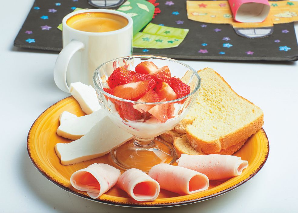 «Un tazón de café cortado con leche de almendra. Un par de tostadas integrales de masa madre con queso de Burgos y pavo. Y un bol con fresas y yogur natural».